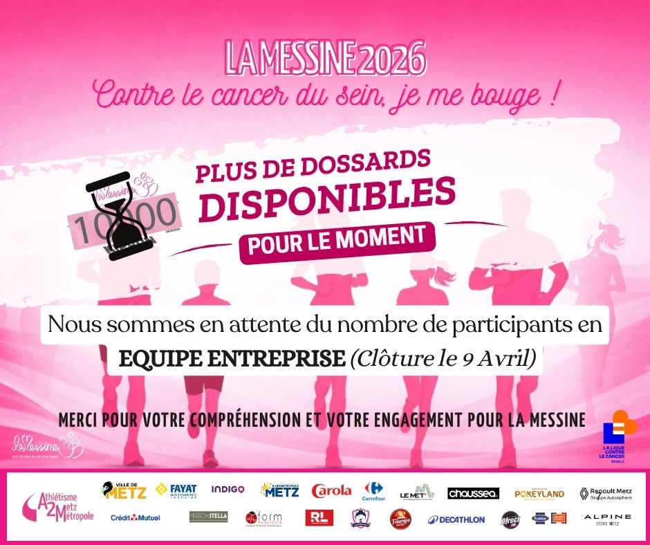 Vous pouvez dès à présent vous inscrire à la prochaine édition de « La Messine », une course solidaire contre le cancer du sein, qui aura lieu le 27 avril prochain. Contre le cancer du sein, je me bouge !